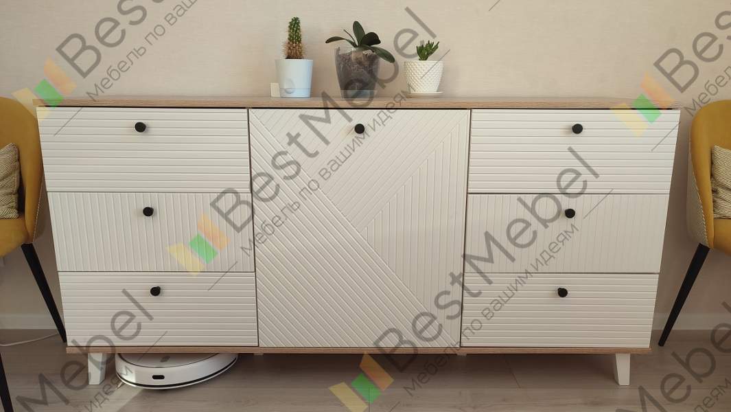 Комод очень понравился. Искали максимально длинный комод, во всю стену и чтобы подошел к интерьеру. Заменили одну полку в центральном отделении на три (добавили две дополнительные). Удобно, что у модели есть ножки и можно выбрать их высоту, чтобы прошел робот-пылесос. Сделан качественно, хорошие материалы, фрезировка фасадов выглядит отлично. Заказ 00000183333