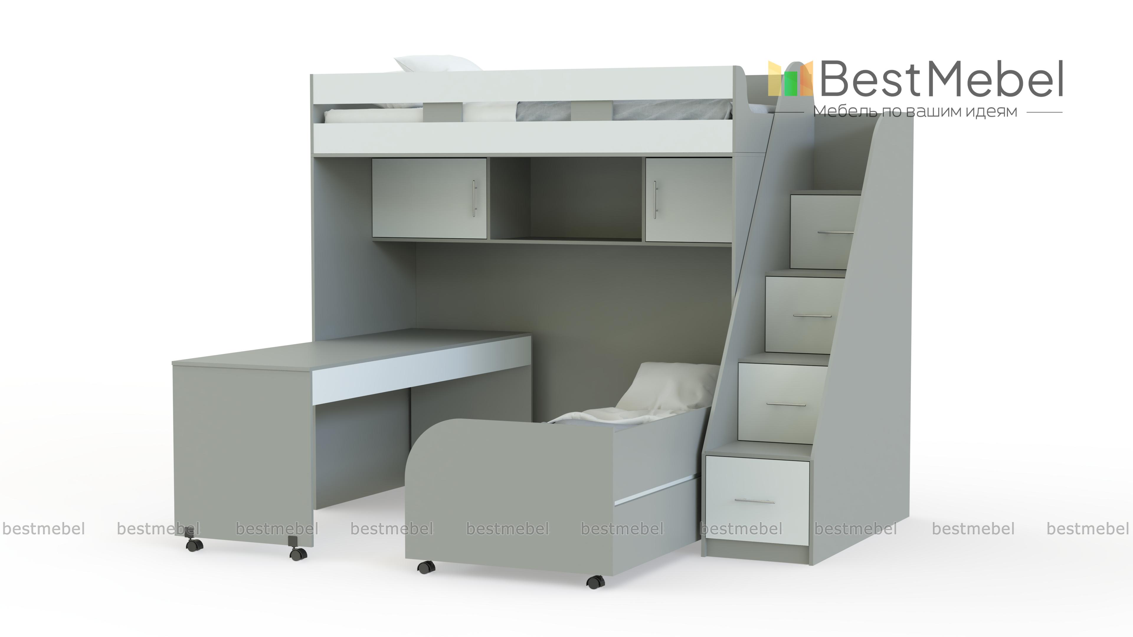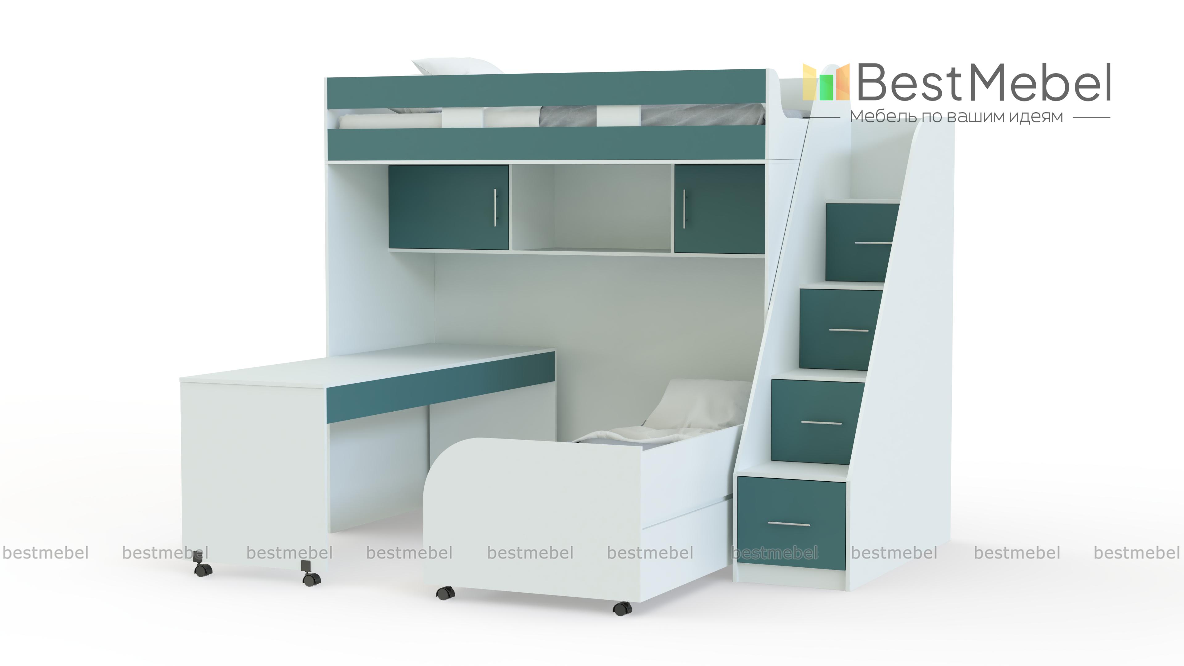 Детская кровать Минима КД-136 BMS представляет собой практичную модель-трансформер, особенно актуальную в небольших помещениях. На втором ярусе располагается спальное место с бортиками, добраться до которого поможет торцевая лестница с удобными ступенями, а в нише на первом скрыты книжные полки, выкатная кровать и письменный стол с колесными опорами. В сложенном виде композиция занимает минимум места и экономит полезную площадь для игр. Купить детскую кровать Минима КД-136 BMS приглашаем в наш интернет-магазин.