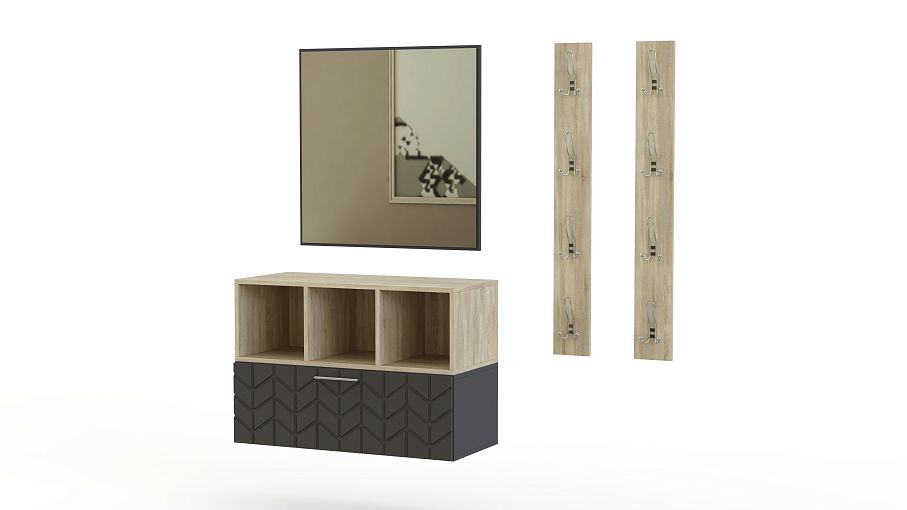 Прихожая Шерон 13 BMS будет эффектно смотреться в современном минималистичном интерьере. Геометричная навесная композиция включает в себя узкие панели с крючками для одежды и аксессуаров, большое зеркало без рамы и комбинированную тумбу для хранения обуви и уходовых средств с тремя открытыми секциями и глухим отделением. Древесные оттенки скомбинированы с нейтрально-серым, подчеркивая строгие четкие линии. Купить прихожую Шерон 13 BMS приглашаем на сайт нашего интернет-магазина.