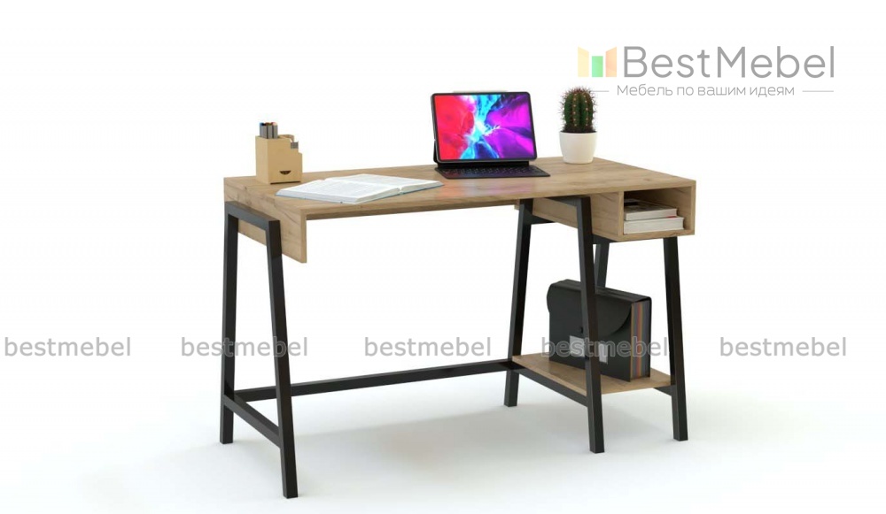 Стол компьютерный Монти 4 BMS выполнен в характерном для лофта сочетании природных древесных тонов ЛДСП и металла. Модель оборудована просторной прямоугольной столешницей из лдсп 22 мм, дополненной открытой боковой секцией для хранения бумаг, и нишей под системный блок. Каркас с трапециевидными опорами придает конструкции устойчивость, прочность и визуальную легкость.
