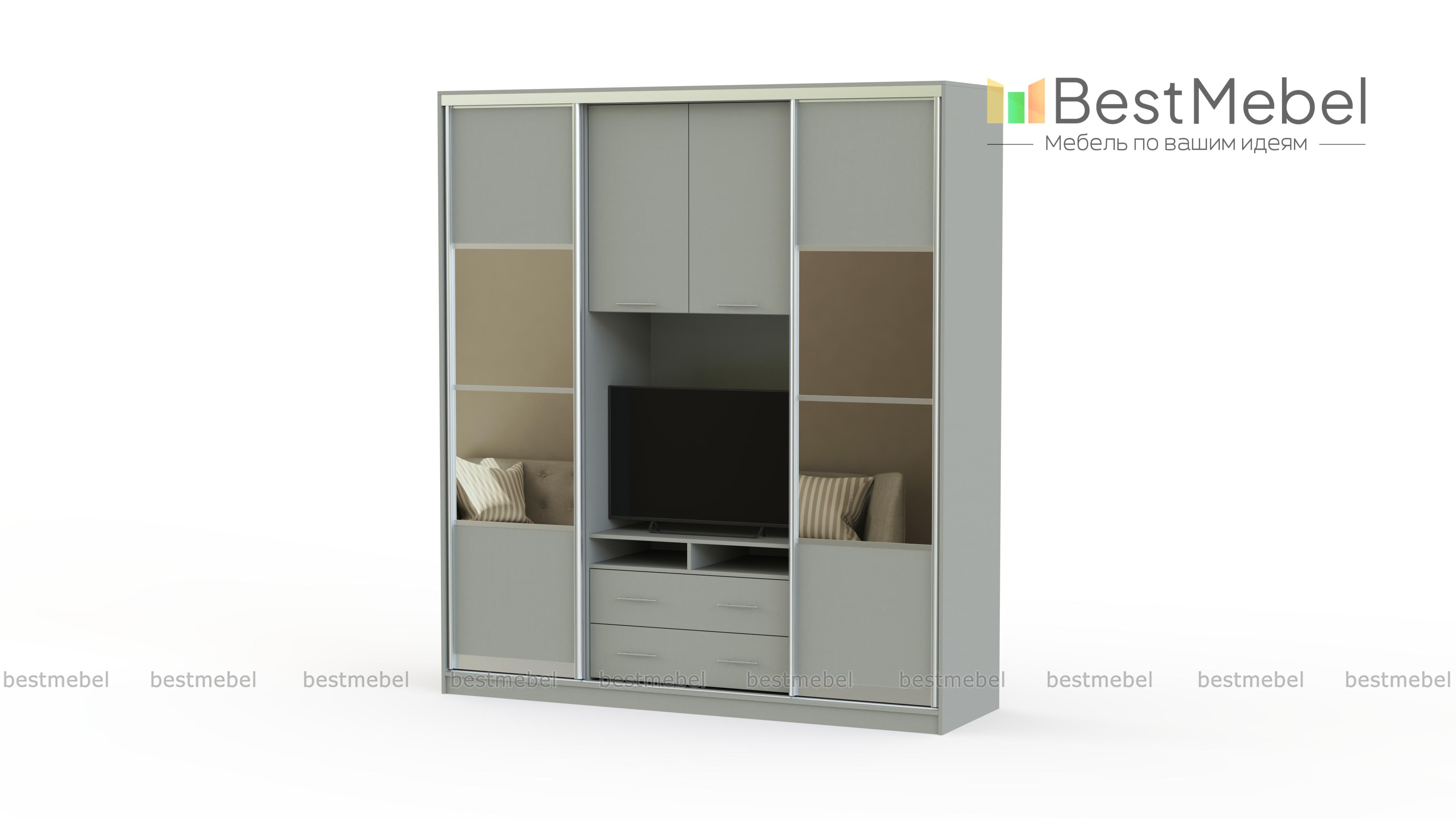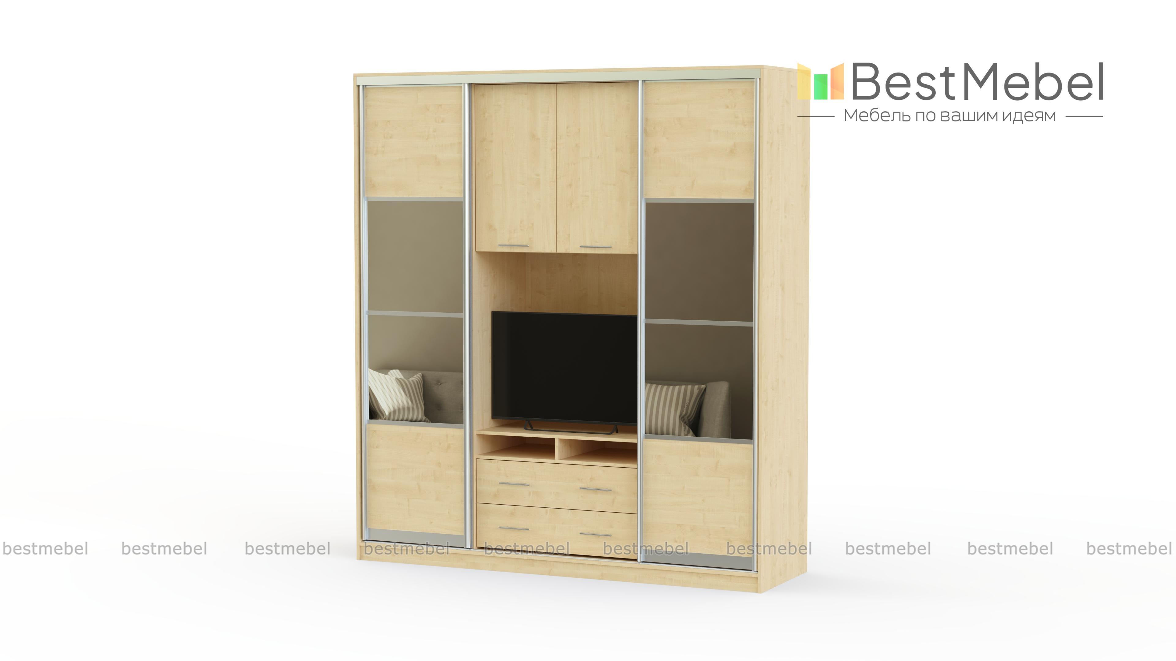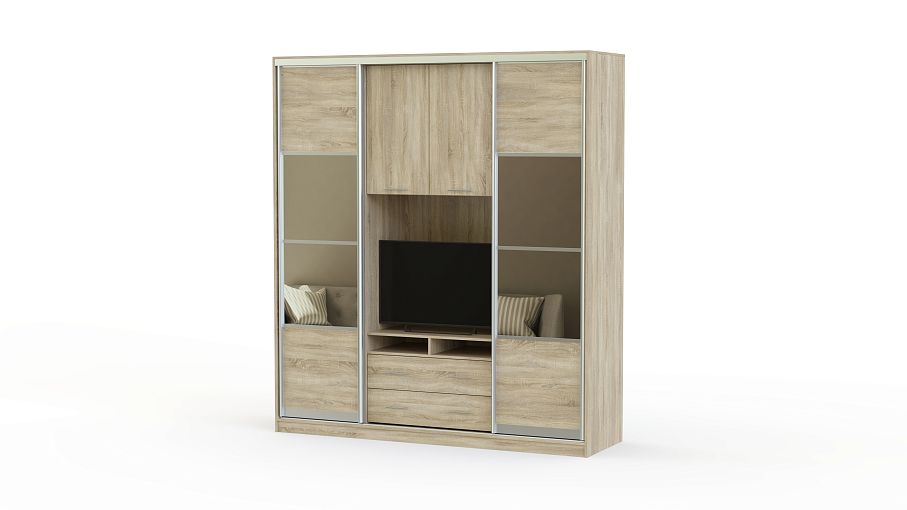 Стильный и функциональный шкаф-купе, который гармонично вольется в классический интерьер. Изделие универсального бежевого цвета повторяет фактуру дерева и дополняется небольшими зеркалами. Последние нужны не только для удобства. Они отражают солнечные лучи, попадающие в комнату, делая ее зрительно больше и светлее. Конструкция шкафа-купе – это просто маленький мир для всех Ваших вещей. Здесь найдется место не только для одежды и обуви, но и продуман отдел, где удобно разместится телевизор и другая техника. Это отличный вариант для небольшой квартиры, которую не хочется загромождать корпусной мебелью, оставив для своей семьи как можно больше пространства.