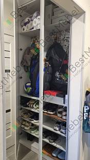 Номер заказа 1212518 Шкаф распашной Арт 4 BMSСделали шкаф под свои размеры 900/350/2400, изготовили за 10 дней, доставка 2 дня.Шкаф пришел целый, собирается легко. При сборке обнаружили что на одной двери отметки для петель не совпадают.Немного изменили положение полок под себя ,добавили штангу и ручки.Шкаф смотрится стильно и дорого, шкафом остались довольны