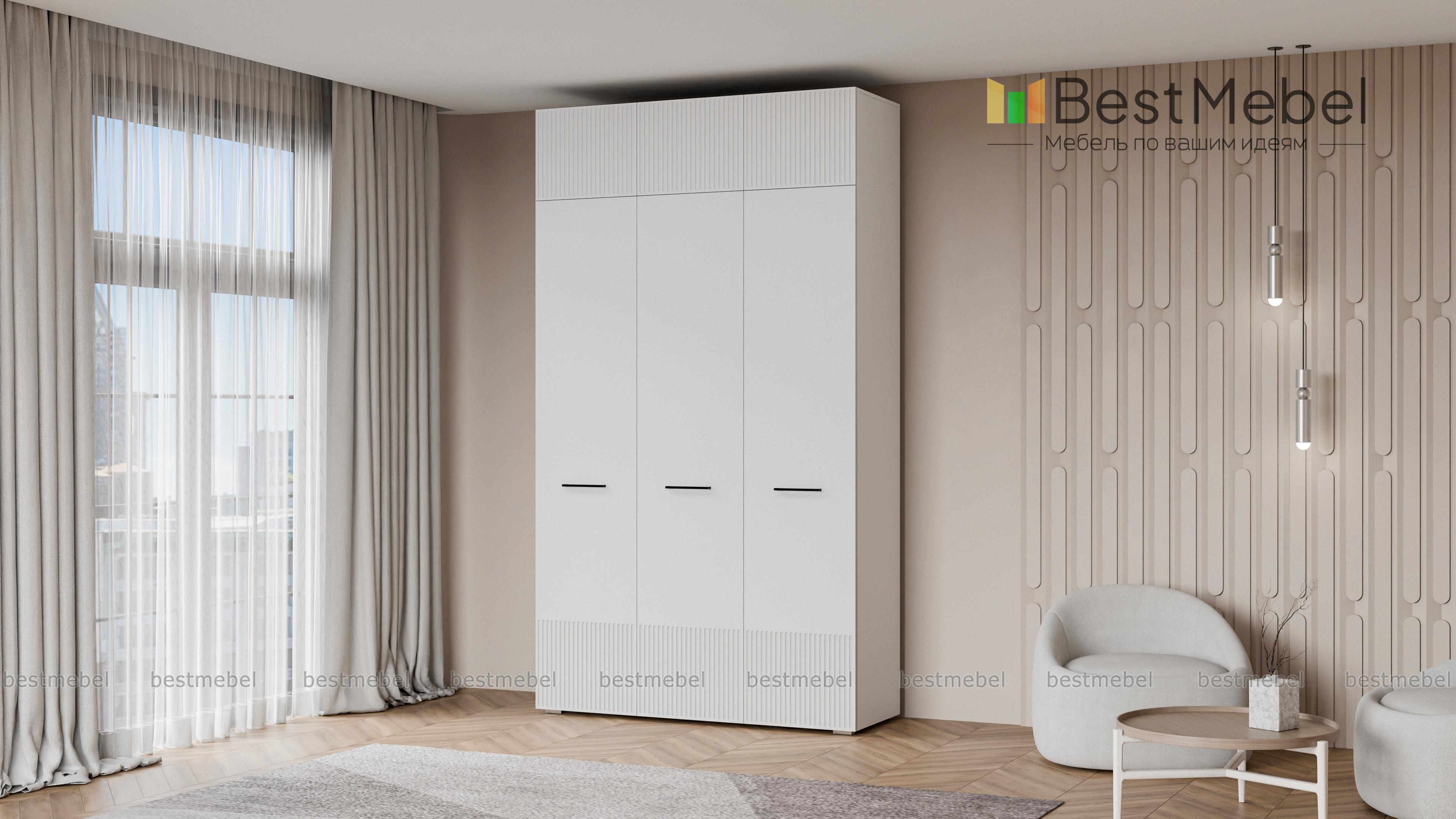 Шкаф распашной Декарт 9 BMS выполнен в современном классическом стиле. Нижняя часть фасада и дверцы антресоли украшены лаконичным стильным рельефом, в роли акцента выступают поперечные ручки-скобы. Платяное отделение справа и ряд бельевых полок слева — оптимально для хранения базового гардероба в спальне, детской комнате или прихожей. Купить шкаф распашной Декарт 9 BMS приглашаем в наш интернет-магазин с возможностью выбора габаритов, цвета и фурнитуры.