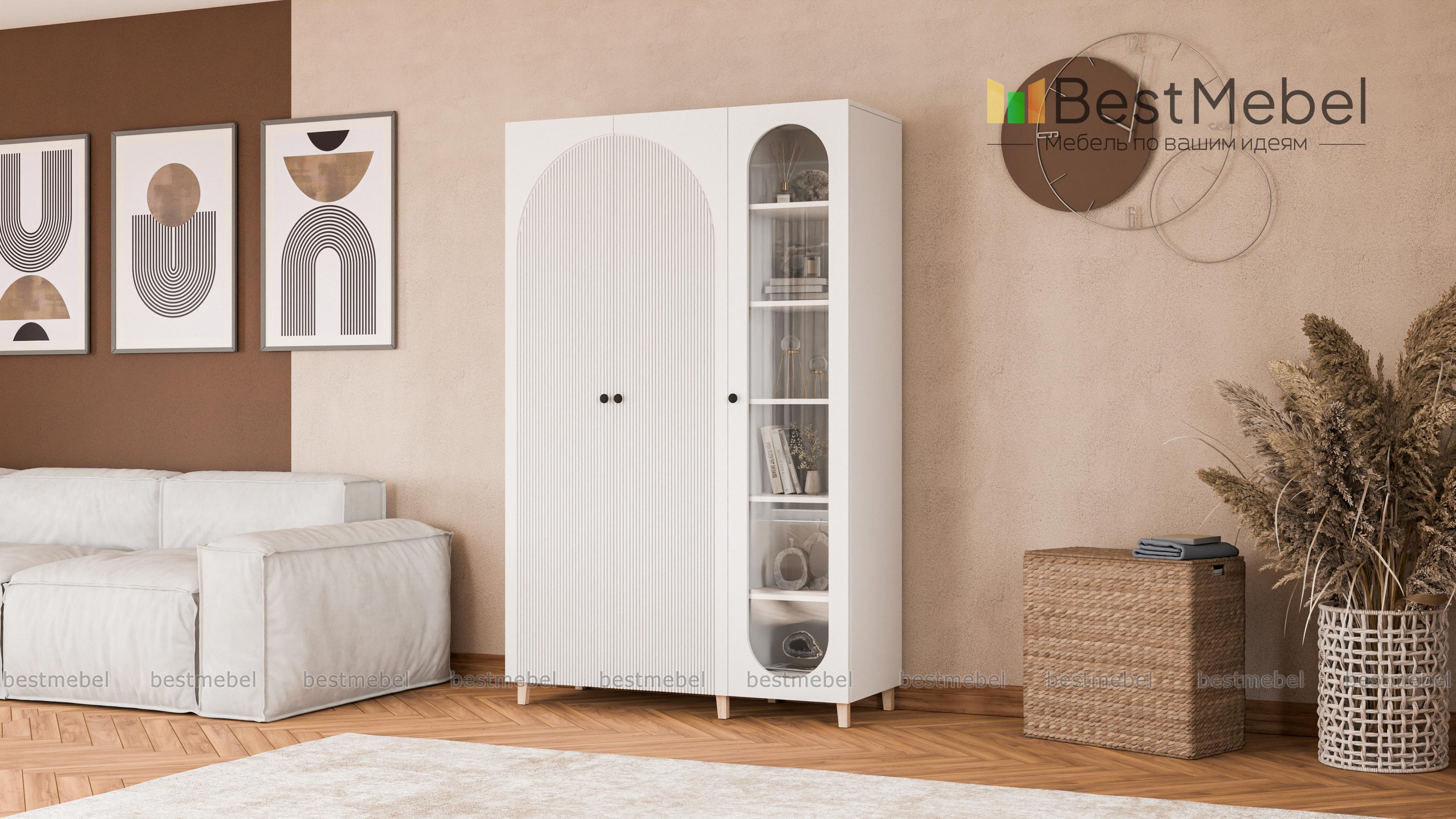 Шкаф распашной Вивьен 21 BMS объединил платяное отделение с двумя дверцами и однодверную витрину. Многофункциональная модель для детской или гостиной позволяет разместить не только одежду, но и книги, посуду, разнообразные мелочи и декор. Каркас и ножки в древесных тонах дополнены износостойкими фасадами из МДФ с фигурными вырезами и стильной фрезеровкой. Купить шкаф распашной Вивьен 21 BMS в любом удобном размере и оттенке из каталога приглашаем в наш интернет-магазин.