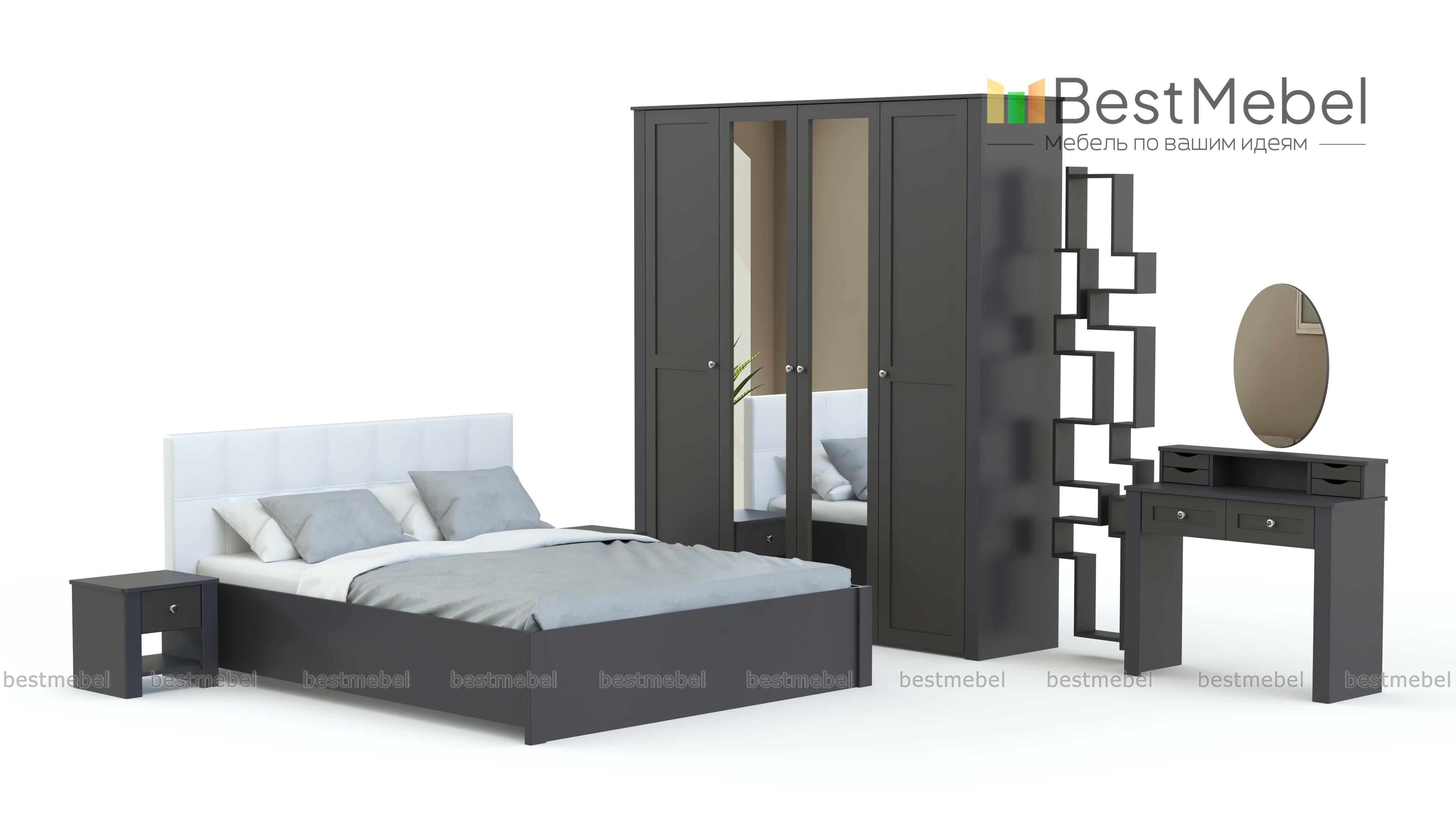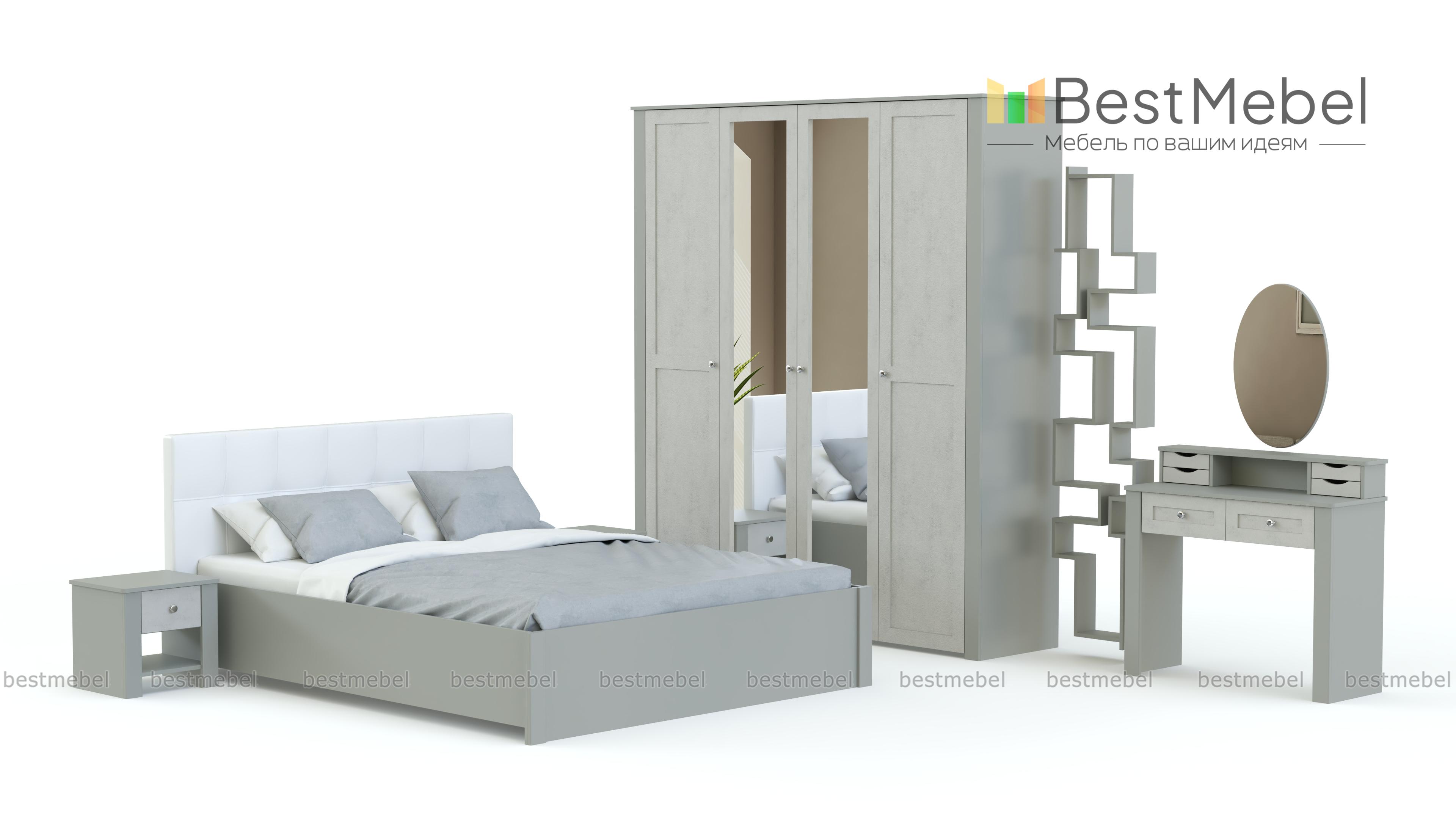 Еще одна модель в полюбившемся владельцам современных квартир и загородных домов стиле прованс. Нежные цвета, элегантный внешний вид и изящный декор делают спальню Бриз комплектация 2 BMS неизменно популярной. Гарнитур состоит из вместительного шкафа с зеркальными дверцами, двуспальной кровати с мягким изголовьем, дополненной оригинальными тумбами, и милого туалетного столика с винтажными ящичками и овальным поворотным зеркалом для идеального макияжа.