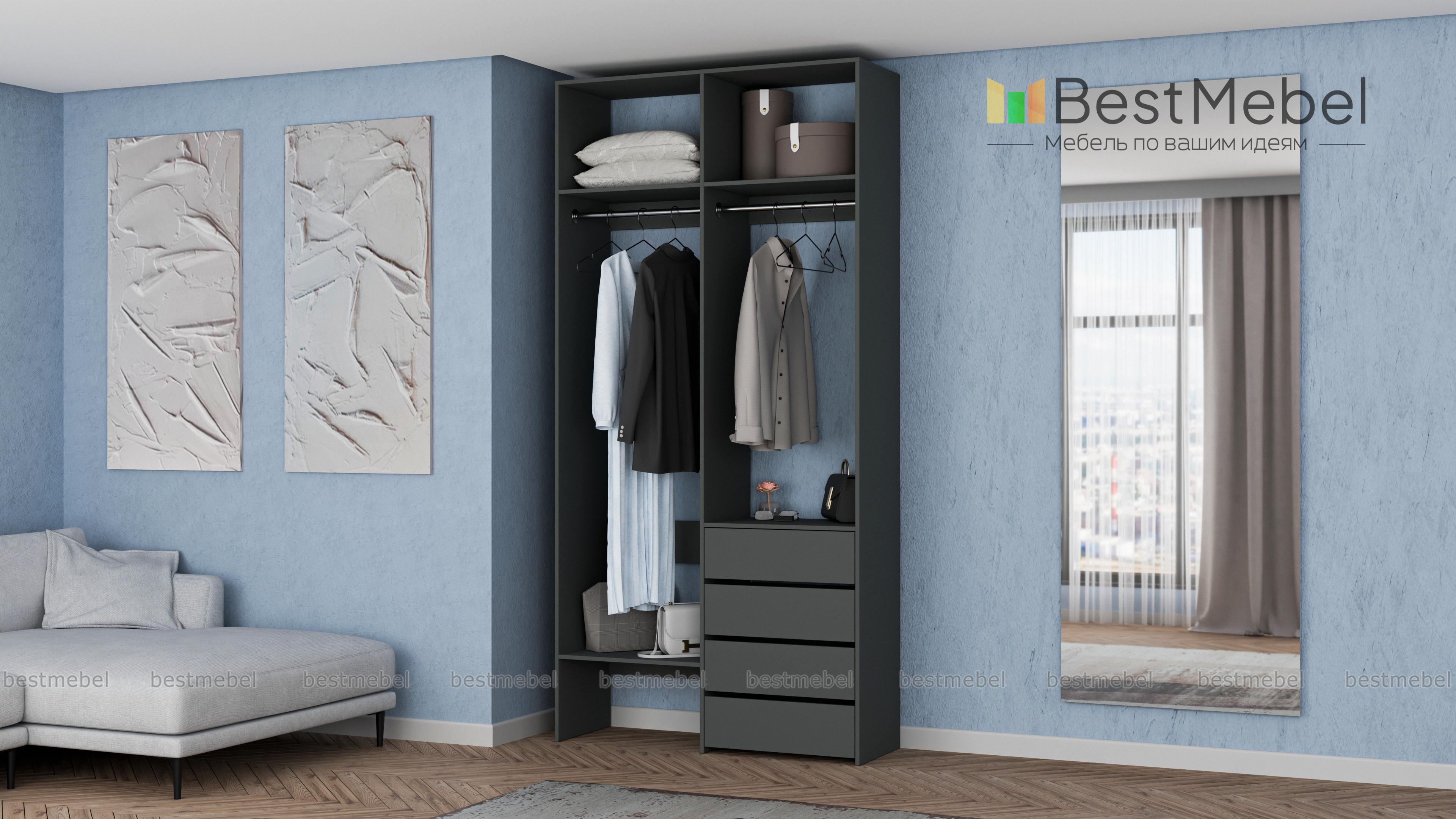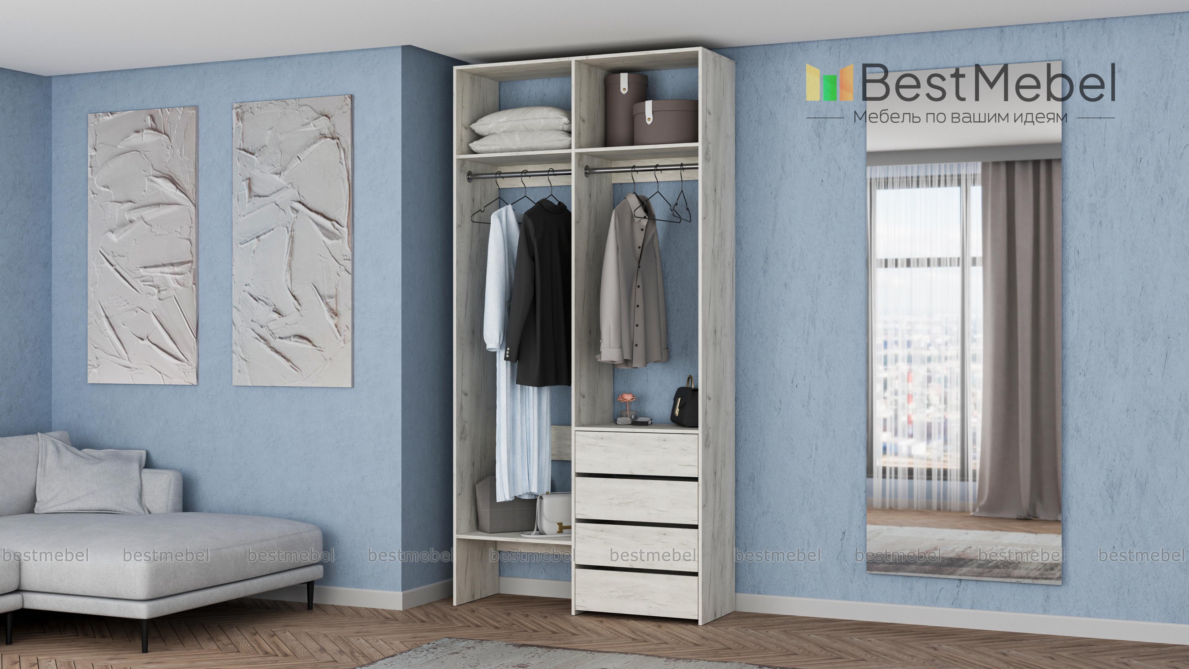 Стеллаж для одежды Мирта 45 BMS позволяет выделить зоны для хранения разных вещей. Комплектация включает в себя отделения со штангами для короткой и длинной одежды, полки сверху и снизу, а также ряд из четырех выдвижных ящиков справа. Двухсекционный стеллаж выполнен в светлом базовом оттенке и отлично смотрится на небольшом метраже. Купить стеллаж для одежды Мирта 45 BMS вы всегда сможете в нашем интернет-магазине, подобрав нужные размеры и оттенок по каталогу.