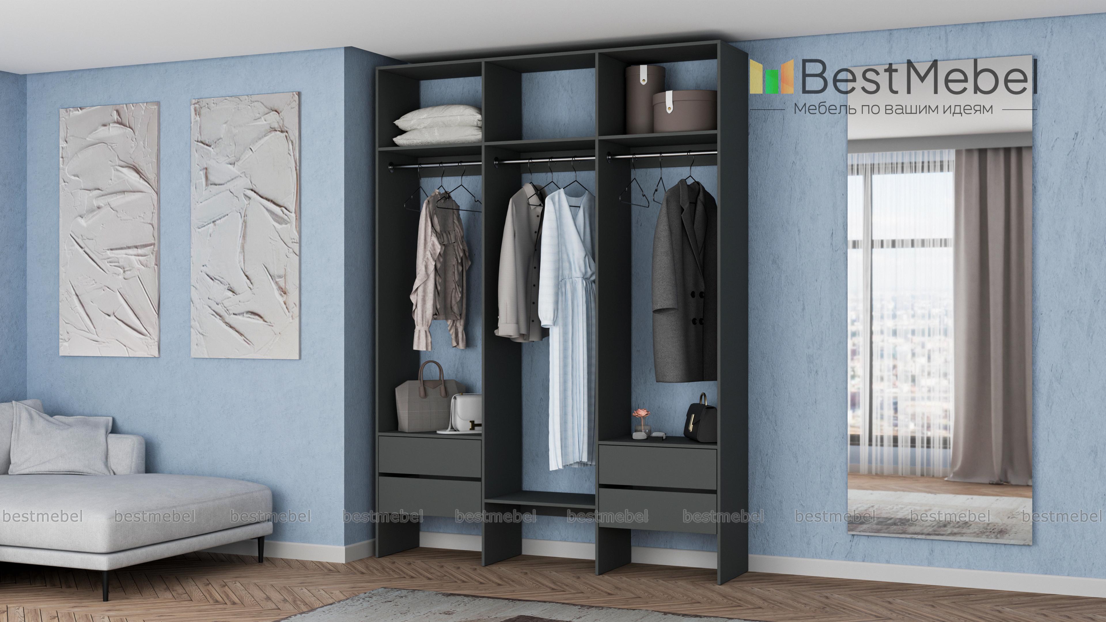 Стеллаж для одежды Мирта 58 BMS — это удобная база для вашей прихожей или гардеробной комнаты. Три перекладины позволяют разместить вешалки с короткой и длинной одеждой, для коробок и сложенных вещей предусмотрены полки, а для мелочей — две пары выдвижных ящиков. Лаконичное оформление и возможность выбора оттенка делают трехсекционный стеллаж практически универсальным. Купить стеллаж для одежды Мирта 58 BMS, изготовленный по вашим размерам, приглашаем в наш интернет-магазин.