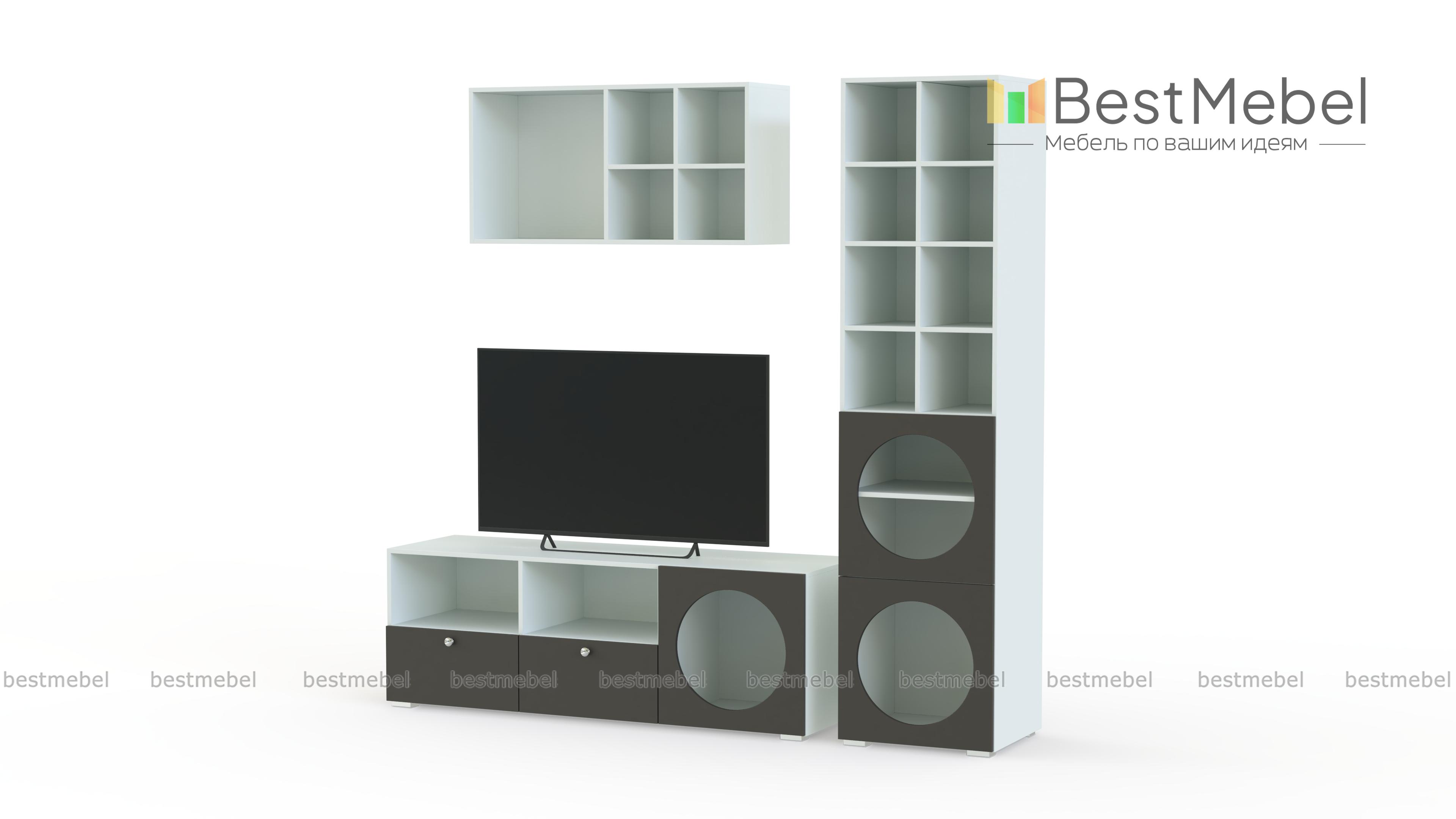Стенка для гостиной Авелин 3 BMS с открытыми круглыми полками поможет оформить комнату в современном стиле. Модульная композиция состоит из ТВ-тумбы, высокого книжного стеллажа и навесной полки, которые комбинируются по вашему вкусу. Благодаря использованию качественных материалов стенка сохранит эстетичный вид на долгие годы. Купить стенку для гостиной Авелин 3 BMS вы сможете в нашем интернет-магазине в необходимом размере и любых оттенках из каталога.