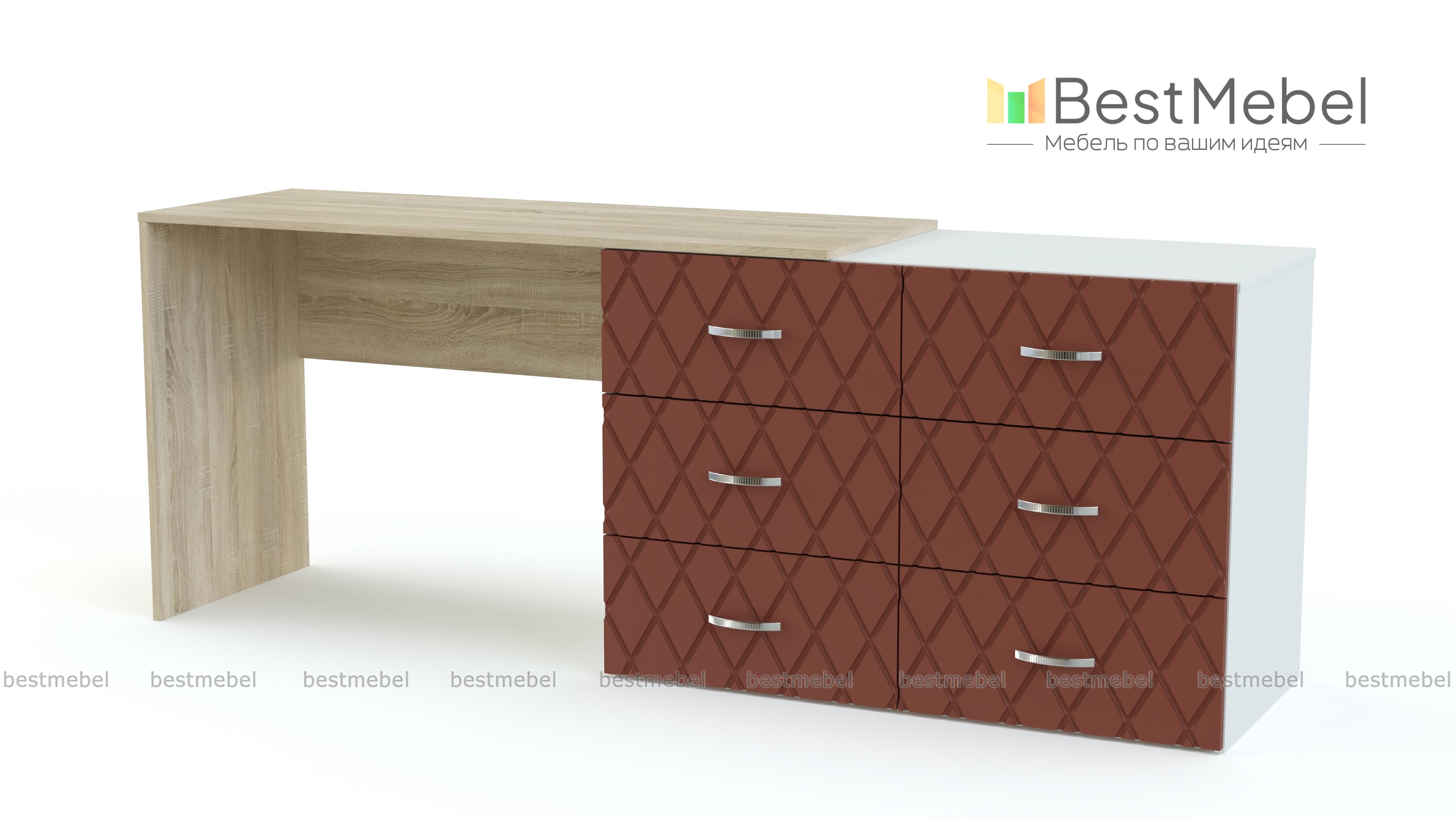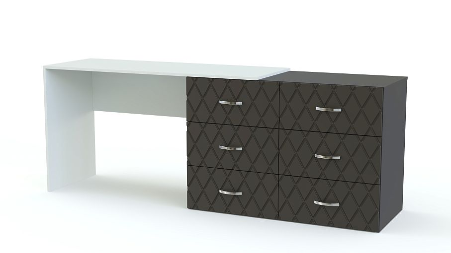 Туалетный столик Сая BMS сочетает в себе современный дизайн и функциональность. Модель, объединившая комод с шестью выдвижными ящиками и просторную столешницу, не только разместит большое количество вещей, но и может использоваться для работы, творчества или ухода за собой. Строгие линии композиции подчеркивает сочетание нейтрального темно-серого и контрастной белой столешницы, фасады комода декорированы фрезеровкой. Купить туалетный столик Сая BMS приглашаем в наш интернет-магазин.