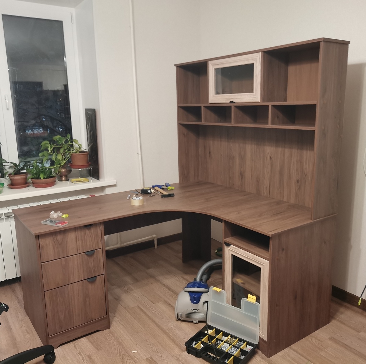 Приобрела стол данной модели в конце ноября 2025 года (заказ № 00000321456).Заказ делала в одном из офисов BestMebel, так как боялась ошибиться или просчитаться с размерами и конфигурацией сама через сайт - мне не была нужна приставная тумба, но нужны были ящики и тумба под единой цельной столешницей по моим размерам, плюс мне было важно живьем увидеть цвета и материалы. Эскиз мне составили быстро и четко по моим пожеланиям, менеджер была грамотна и терпелива (конечно же у меня были муки выбора цвета, ручек, фурнитуры, как без этого!).Отдельный респект за то, что перед запуском в производство вам направляют по почте на согласование технический чертёж с размерами, который получился по итогам составленного при заказе эскиза, и на этом этапе можно что-то поправить. В этом плане опасения насчет дальнейших самостоятельных заказов через сайт отпали.Производство и доставка были осуществлены без задержек, в обозначенные изначально сроки. Доставка порадовала аккуратностью, все было цело-невредимо, а еще человеческим согласованием времени доставки, что для работающего человека вот реально важно.Сборкой занималась сама, и для этого к доставленному товару прилагается очень удобная схема (не та, что распечатанная, а та, что по qr-коду на распечатке). Все доставленные вам детали пронумерованы, и каждую из деталей вы можете по номеру найти на интерактивной схеме и увидеть, как и где она должна быть расположена. Короче рукодельники получат от сборки отдельное удовольствие! Все необходимые отверстия уже просверлены, все необходимые крепежи в нужном количестве (и даже с небольшим запасом) приложены. Собранный стол полностью соответствует моим ожиданиям, качество материалов порадовало (первые пару дней был запах дерева в комнате, но никаких химических запахов), при сборке проблем (типа кривого распила) не возникло. Рекомендую!
