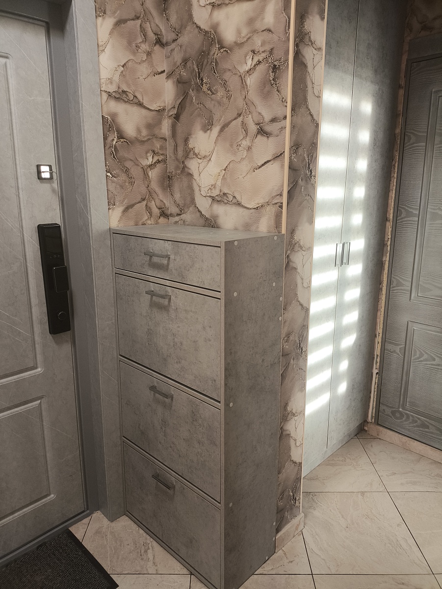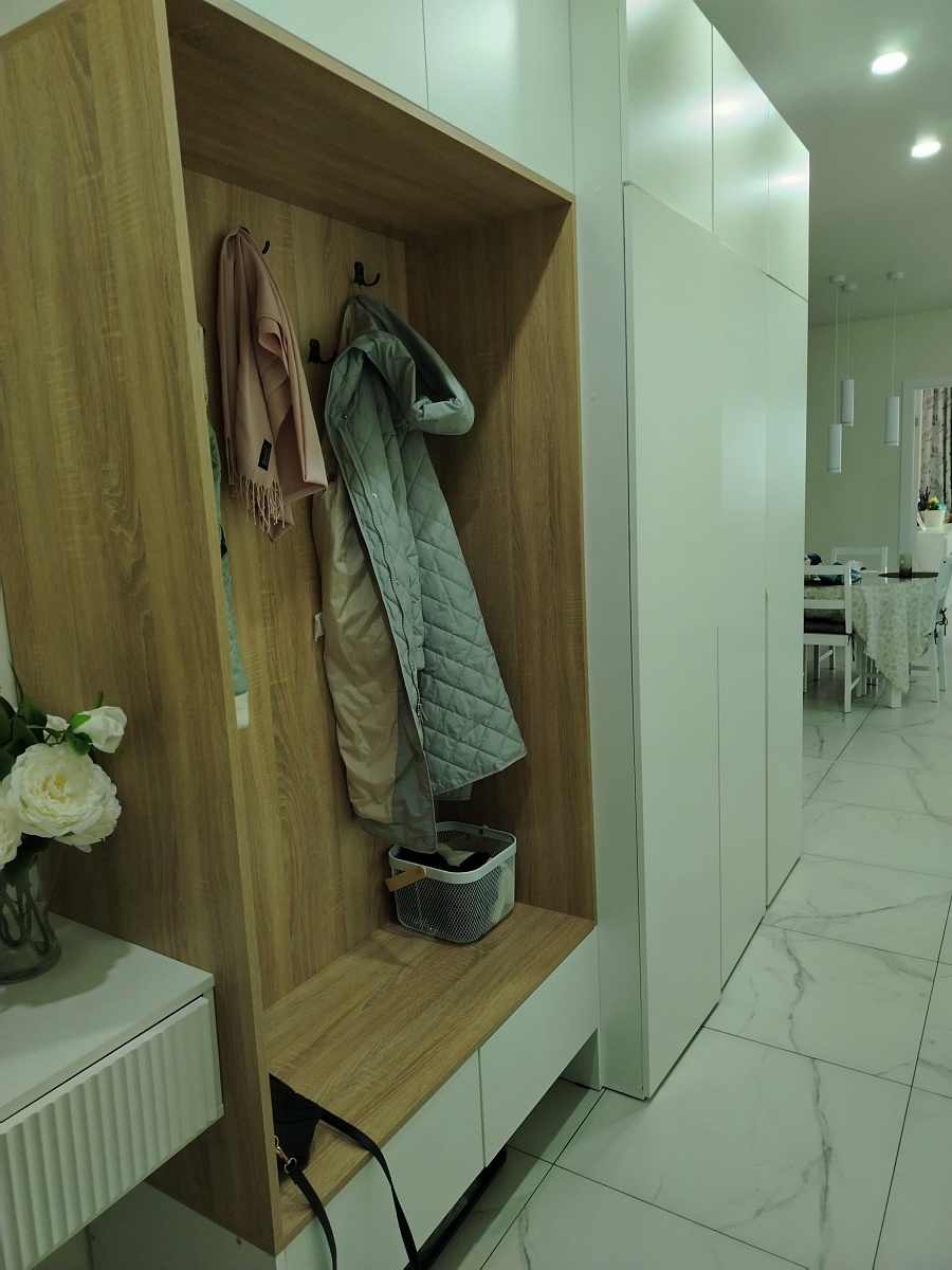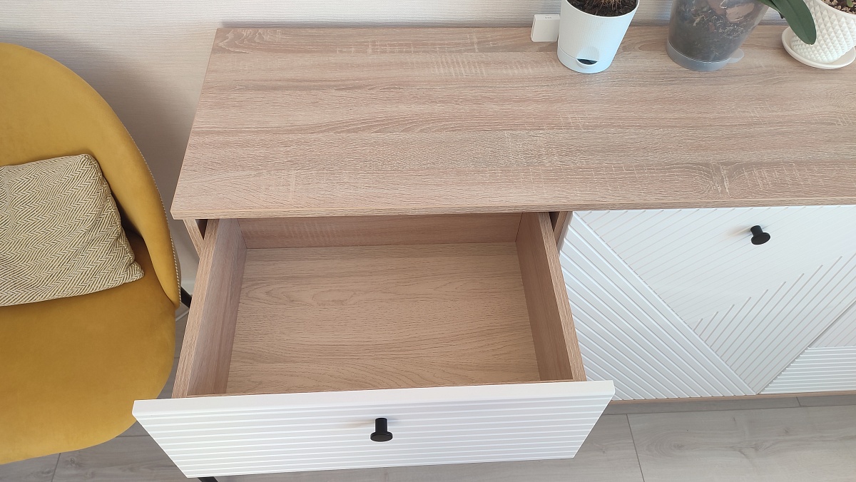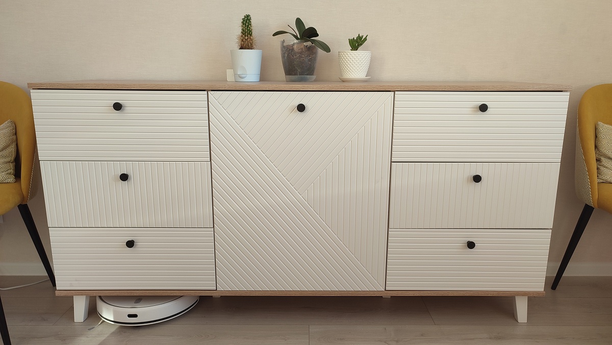 Комод очень понравился. Искали максимально длинный комод, во всю стену и чтобы подошел к интерьеру. Заменили одну полку в центральном отделении на три (добавили две дополнительные). Удобно, что у модели есть ножки и можно выбрать их высоту, чтобы прошел робот-пылесос. Сделан качественно, хорошие материалы, фрезировка фасадов выглядит отлично. Заказ 00000183333