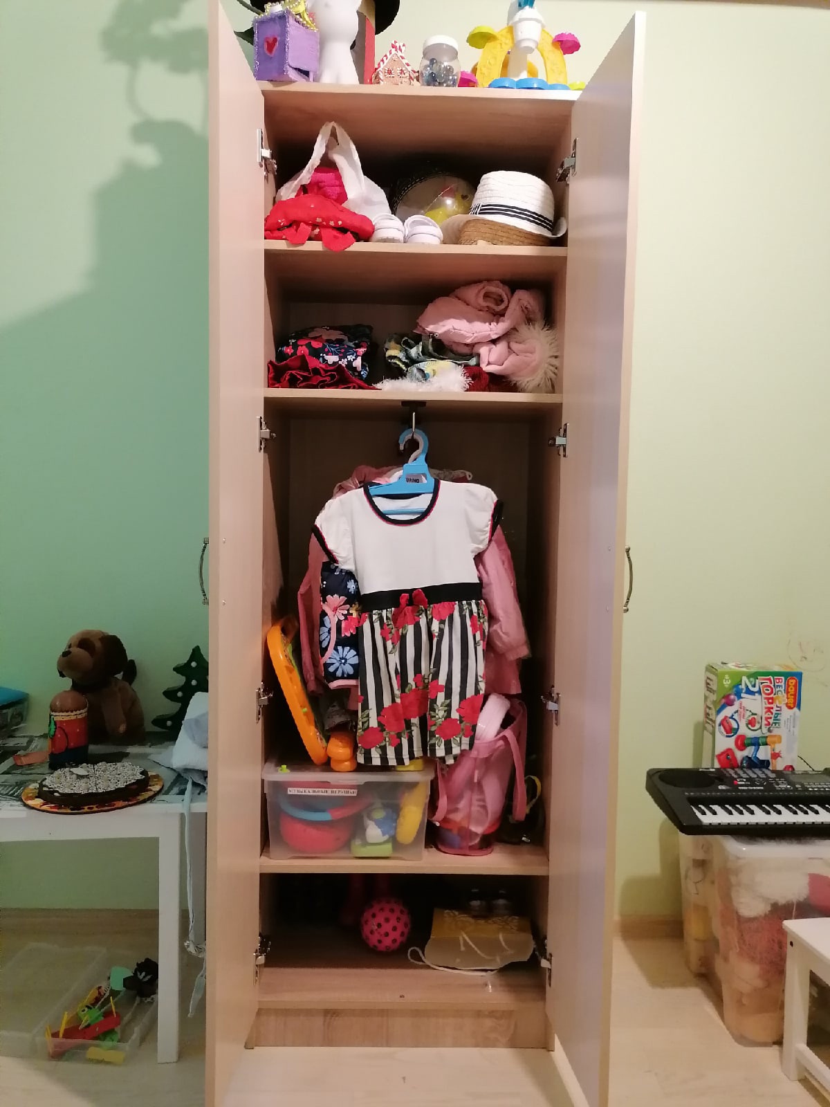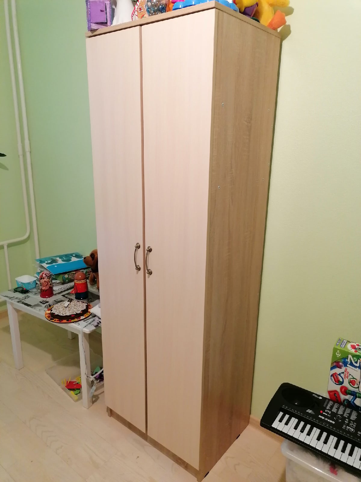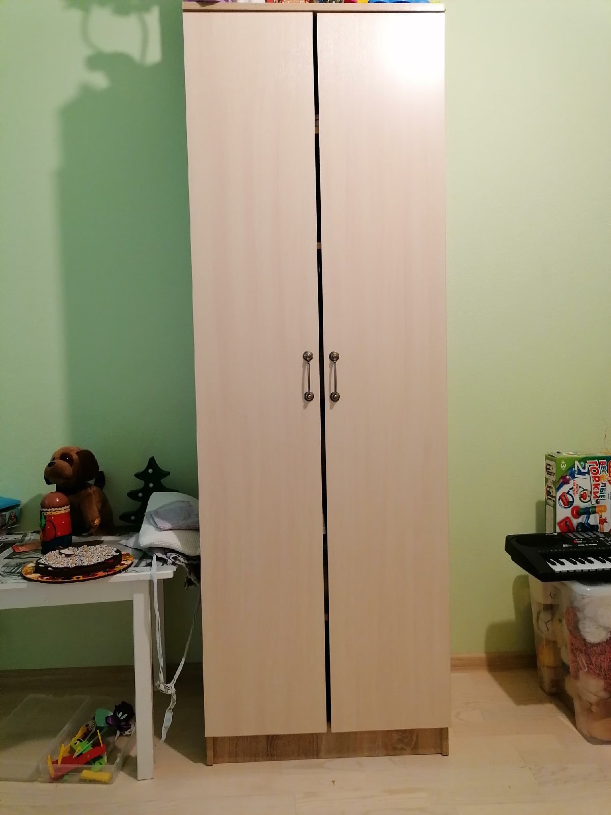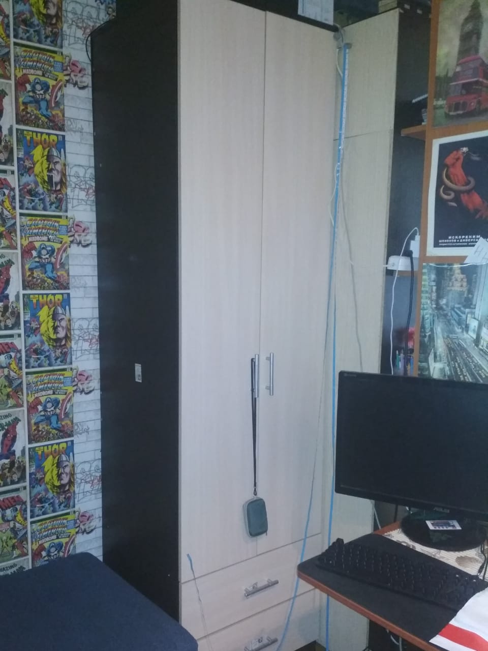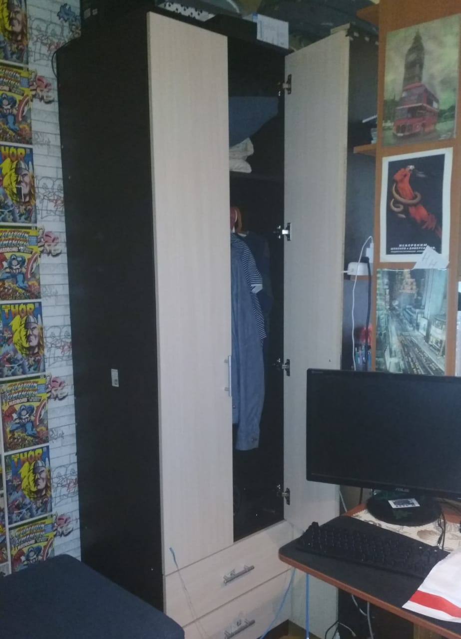 при выборе этого шкафа надо было решить несколько проблем: вписаться в маленькое пространство тесной комнаты; подобрать цветовую гамму под уже имеющиеся элементы обстановки; угодить подростку. Все проблемы оказались решены этой моделью - размер скорректировали идеально, чудом уместился в тесноту подросткового уголка,  цвет тоже подошел - и главное, все уместилось, несмотря на скромные размеры самого шкафа. Оказался очень вместительным.В сборке, как всегда - все очень просто, понятно - фурнитура даже с небольшим запасом (гвоздики-винтики). Двери подгонять практически не пришлось, петли уже изначально подтянуты как надо (чуть-чуть подтянули).Сыну нравится. Собрали с ним неспеша практически за пару часов, не напрягаясь особо.Заказ 00000559915
