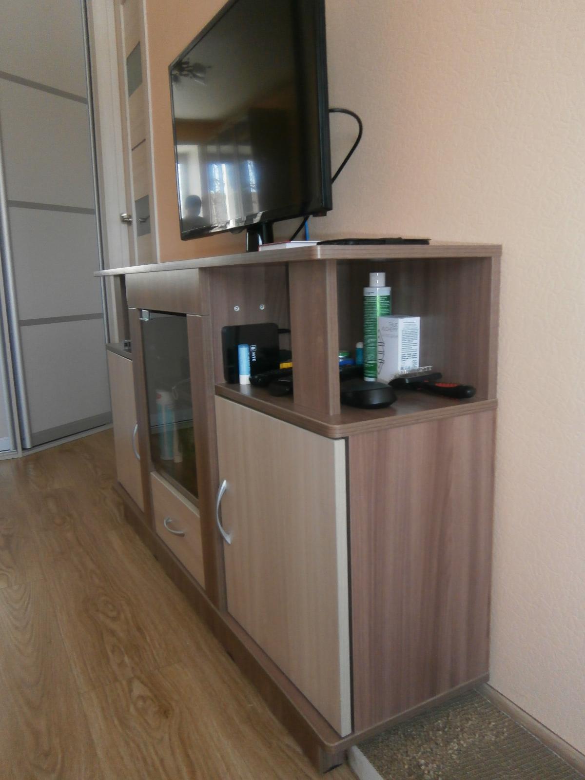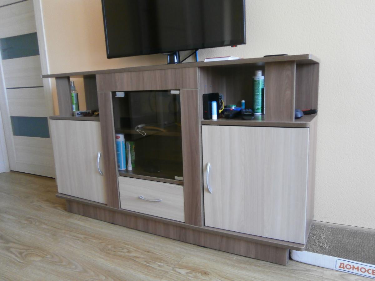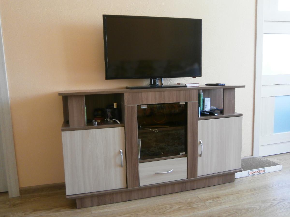 Заказ 00000564751, изделие Тумба под телевизор Виста-11 BMS (1300х750х300)Было необходимо подобрать тумбу под TV по ранее выбранной цветовой гамме мебели и размерам. Оформили заказ в BestMebelShop: тумба под телевизор Виста-11 BMS , габариты 1300х750х300 мм. Это наша вторая покупка в этом интернет-магазине за полгода. Изготовили за 3 дня, доставили в согласованное время — в 23.30. До оплаты  курьеру наличными была возможность проверить качество и комплектацию изделия — все ОК. Схема сборки (простенькая) имеется, проблем с самостоятельной сборкой не было. При оформлении заказа выбрали дополнительные опции: ПХВ кромка 2*19 мм, петли с доводчиком, ручки Боярд сатин (металл).Стоимость заказа 9550 руб., с учетом имеющихся у нас бонусов за первую покупку всего к оплате с доставкой вышло 8287 руб. Аналогичные изделия есть в магазинах под заказ, сроки изготовления от 14 до 45 дней, 50% предоплата. Покупкой довольны. На фото две стеклянные дверцы заменены на одно (стекло бронза   360х370 мм) — так удобнее.