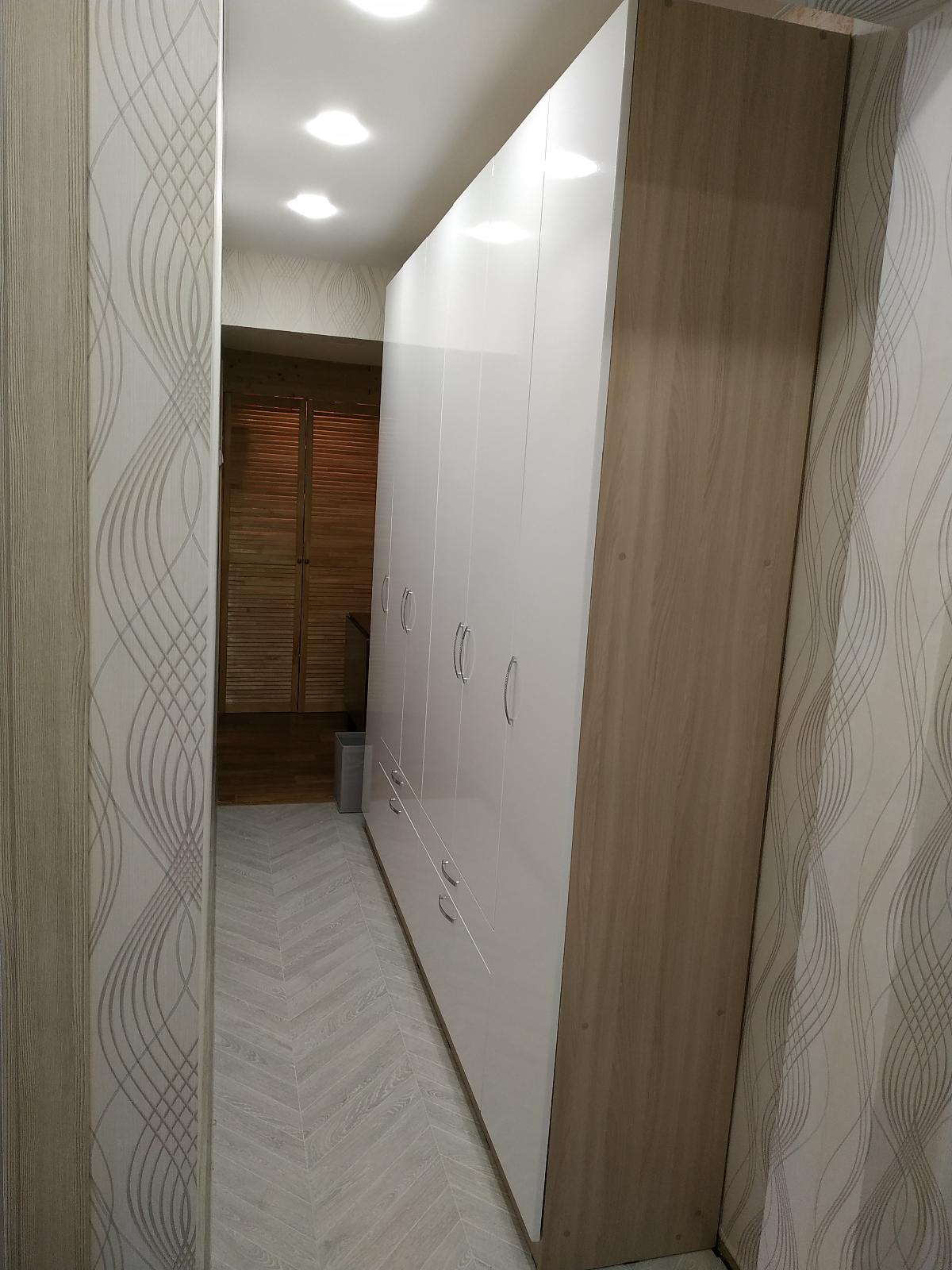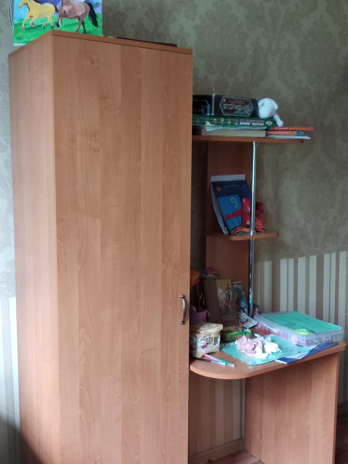 Шкаф нас удивил. Он оказался длинным и тонким (НЕ таким широким и коротким как на ваших картинках). Матового стекла в нем тоже нет. Он весь деревянный (или что там за материал). Мы думали хранить в нем папки, но они, конечно же, НЕ везли. В итоге мы приспособили его под детские вещи и, в целом, довольны. Смотрится стильно, как видите на фото (сверху лежит рамочка, не обращайте внимания). Убираться очень удобно, когда мебель висит. Благодаря вашей компании столы у нас тоже навесные и мы счастливы)