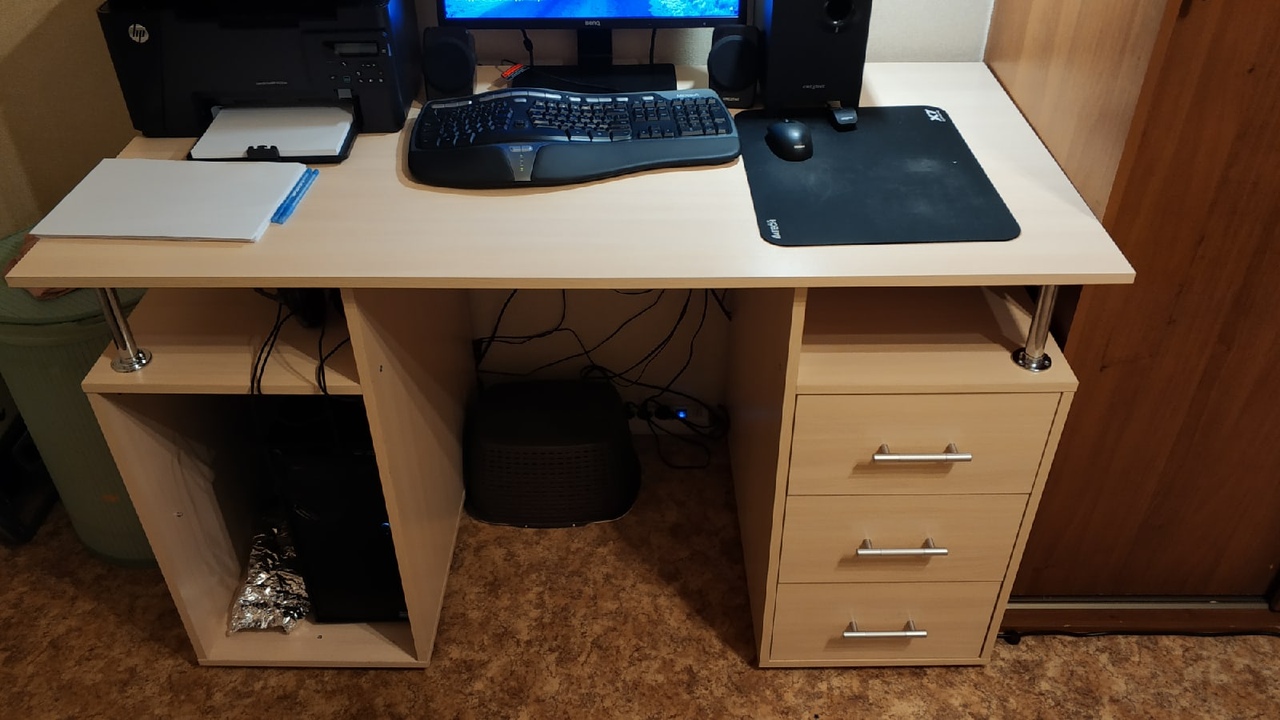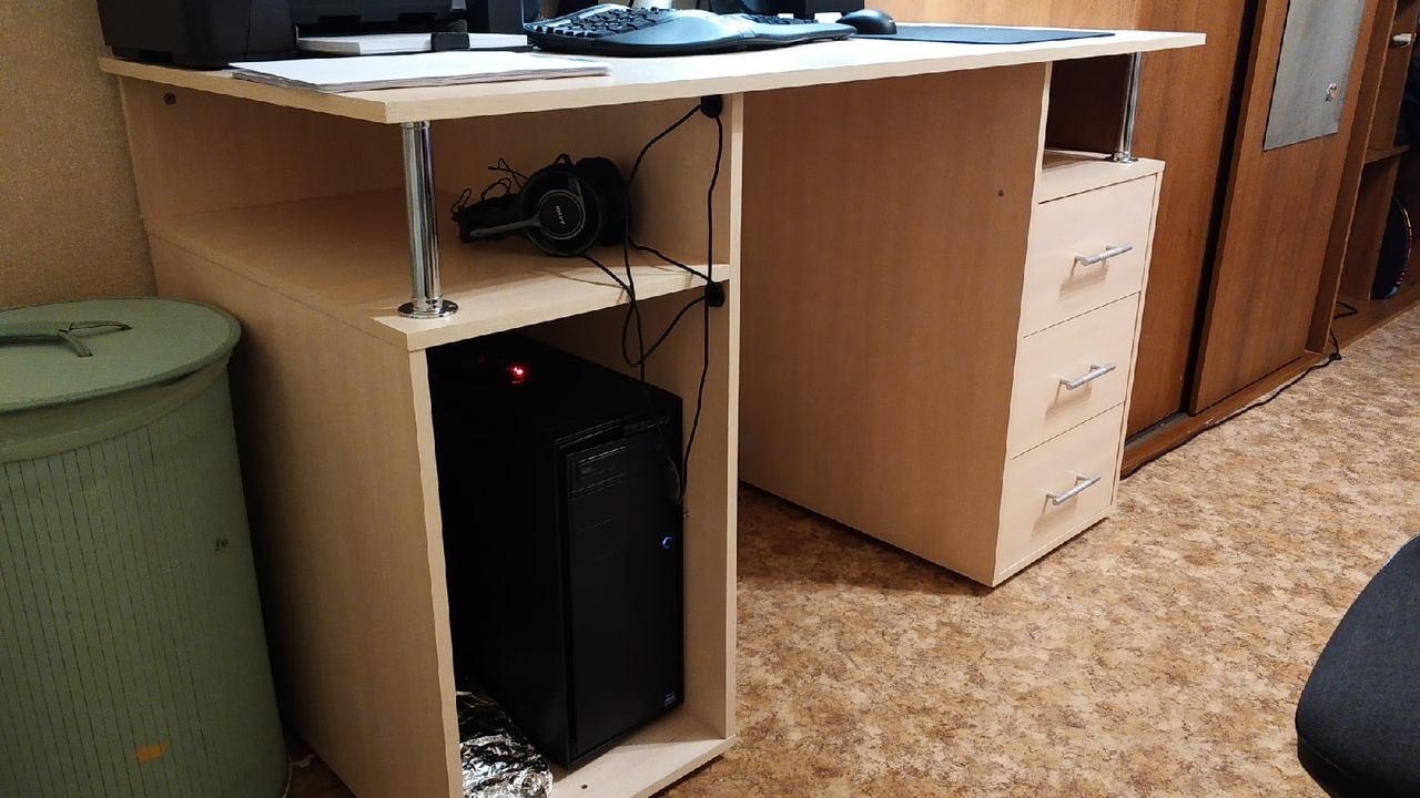Стол приобретался для домашнего ПК.Долго выбирали фирму и модель - она должна была уместить в себе все необходимое для компьютера и оставить место для бумаг и канцелярии. Не прогадали. Правда, стол мы взяли нестандартный - заказали его более широким и длинным. В итоге на столе уместился габаритный принтер под А4, вся компьютерная периферия и, при этом, оставалась свободной примерно половина плоскости стола.В целом, за 3 месяца использования, можно сделать такие выводы. Из минусов, главный - стол тяжёлый, двигать его тяжеловато; из более мелких - боковые железные столбики (вверху, для поддержки) часто наклоняются, что делает нагрузку на стол неравномерной, а место под компьютерный блок слишком большое (для вентиляции хватило бы и меньшего места. Но это, скорее, на наш взгляд). Из плюсов - удобное скольжение мыши по поверхности стола (и оптической, и проводной. Но второй чуть лучше), просторное место для компьютерного стула (хватит на полный ход стула вверх и ещё останется место для подставки под ноги), эргономичность (3 ящика с большой вместимостью, свободное место на столе при полной "загрузке" переферией, +2 полки под основной поверхностью стола.В целом, если брать оценку по 10-ти бальной шкале, то можно поставить 9. Для нас, как мы уже писали выше, тяжесть стола - основной минус, она и забирает 1 балл.Заказ 00000286819