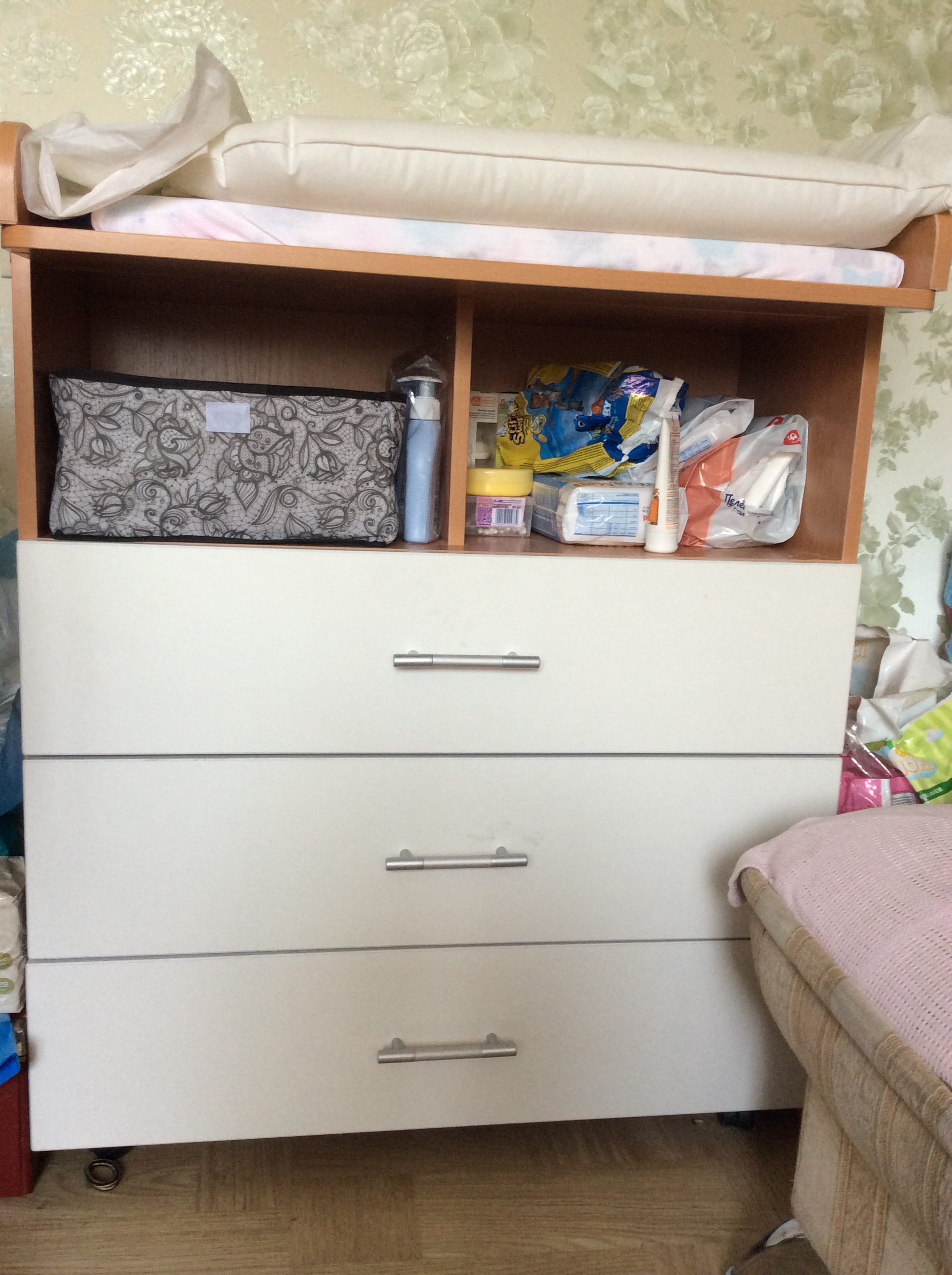 Хороший комод, аккуратный и небольшой, что актуально для недостатка места. Из плюсов: колеса, так что передвигать удобно. Ящики хоть и узкие, но для маленького ребёнка места достаточно, и две ниши удобны для того чтобы ставить предметы которыми часто пользуешься. Небольшой не достаток что сам пеленальный столик располагается продольно комоду, что нужно учитывать и организовывать бортик на наружную сторону, но зато место экономится.